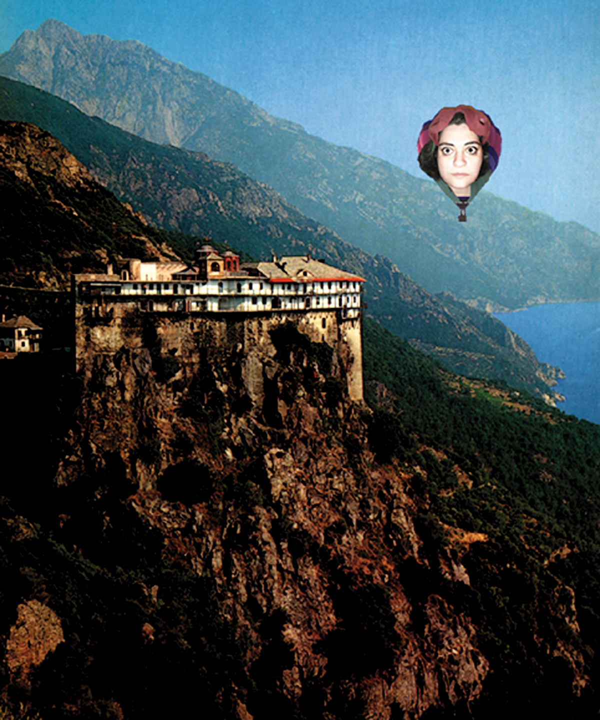 Maria Papadimitriou’s hot air balloon is a light intervention that openly challenges Athonite tradition without breaking Greek laws. The hot air balloon, bearing an iconographic image of the artist’s face, recalls the monks’ veneration of the Virgin Mary’s face on auratic icons. Papadimitriou also takes her cue from the birds, approaching the peninsula by air, albeit without landing.