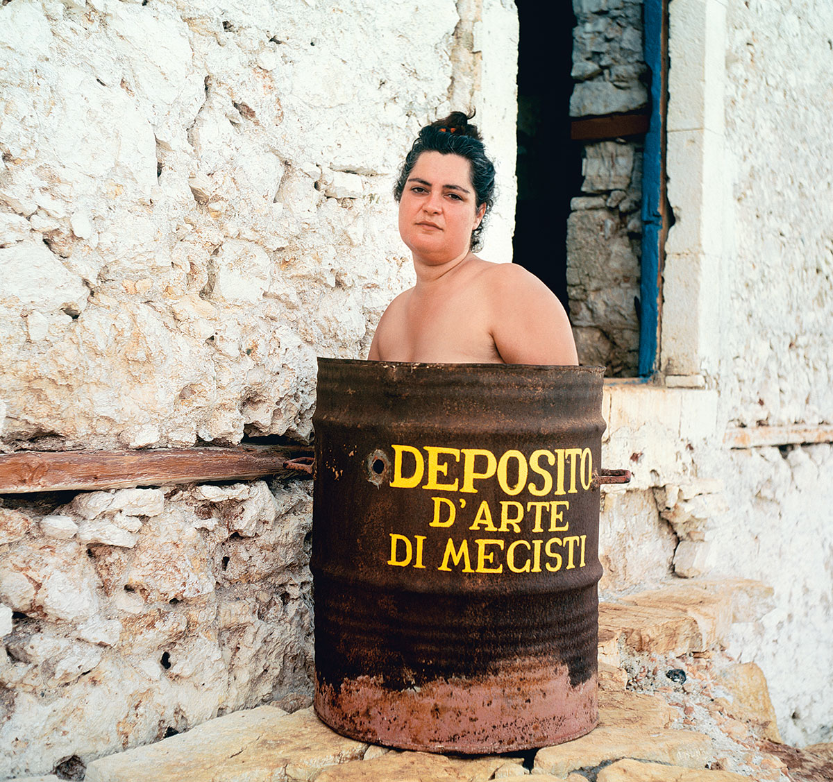 During the summer of 1993, Papadimitriou was on the smallest and most remote island of Dodecanese, Kastelorizo, and she photographed herself naked inside an old wooden barrel on the side of which she had written in gold letters Deposito d’Arte di Megisti. The juxtaposition of text and image on the work makes its case through incongruity. Papadimitriou strategically played with the word “Megisti,” the name of the only town on this minuscule five square-mile island, which means the “largest” or “biggest.” Amused by the paradoxical use of the word, Papadimitriou extended the irony of this contradiction by generating a parallel incongruous framework by placing her own voluminous figure inside the smallest possible fitting repository, a barrel bearing the term “Megisti” on the exterior.