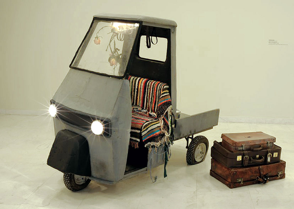This work was exhibited in the foyer of the National Theatre, situated in downtown Athens in Omonia Square, which is an area commonly known for its large Afghan refugee community. Papadimitriou built the tricycle, resembling a theatre prop, out of papier-m.ch. and decorated it with cloth and materials that were available in the theatre’s costume depots.