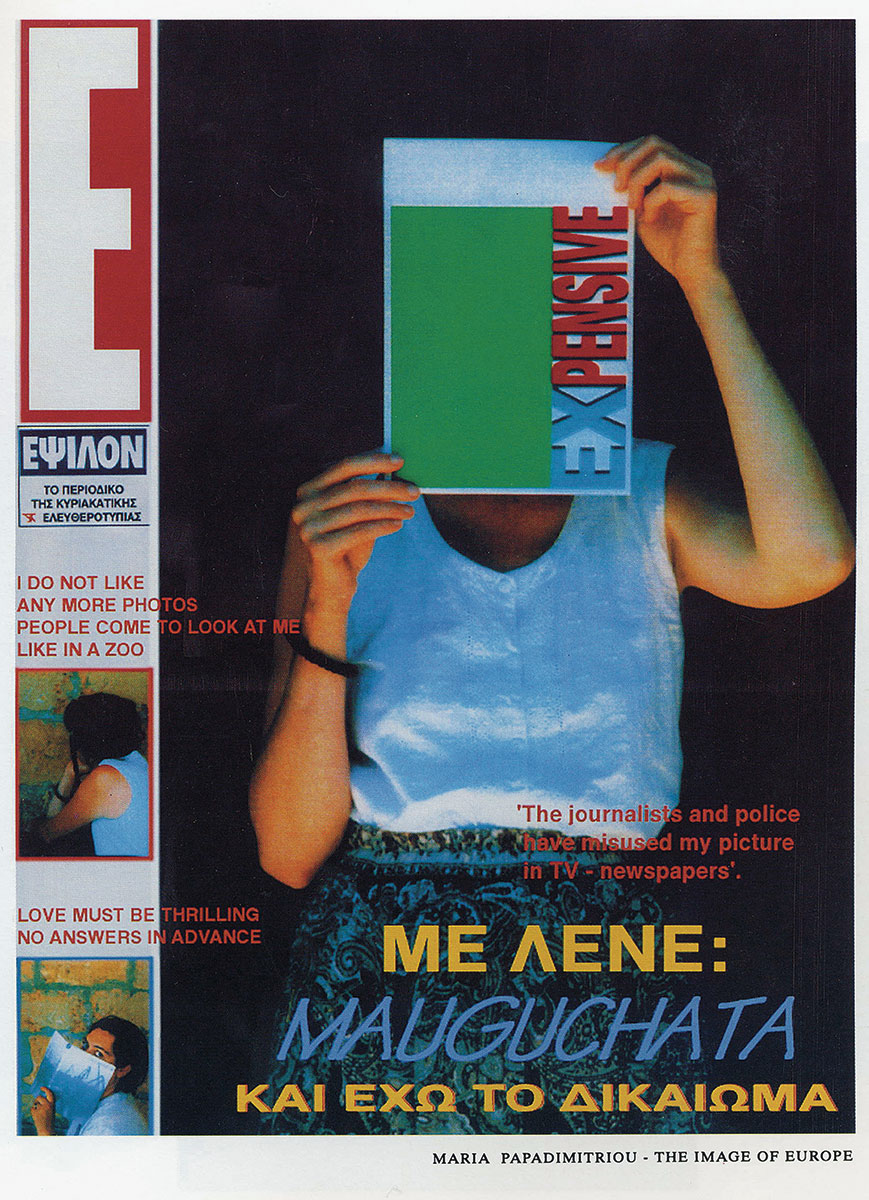 In the context of the exhibition “The Image of Europe” Papadimitriou produced a poster where she re-designed the cover of one of the most widely distributed newspaper magazines in Greece, “E.” She responded to Mauguchata’s request for personal freedom (as she was being held up in a monastery) whilst the media incessantly published her portrait everywhere. The poster became Papadimitriou’s personal vision of the story, relating the facts as she saw them fit to relate. In which instance, she wrote the word EXPENSIVE across Mauguchata’s concealed portrait, claiming “our faces are expensive” and “our existences are expensive.”