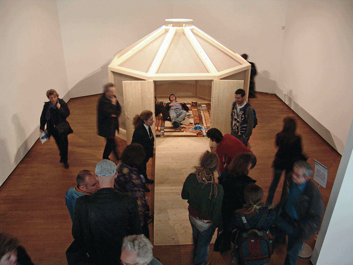 Papadimitriou created her own version of a Mongolian ger tent to rethink mobility and memory as one strategy for alternative living. The circular tent with a hole in the roof and a door is the portable home of Mongolian herdsmen; the same structure – known as a yurt – is used by nomadic herdsmen across Central Asia. […] Its significance is demonstrated in the Kyrgyzstan flag, which features the tent’s roof ring; a family’s history can be measured in the smoke marks that have collected on the ring over the years. The ger and the yurt – easy to transport and quick to construct – are not only a way of life but also a way of living history for nomads in Central Asia. While inspired by these histories, Papadimitriou experienced the ger tent close to her home in Athens during a Reiki treatment. [...] Like nomadic culture, Reiki lives through oral tradition. [...] To combine these nomadic histories – the ger as a home for herdsmen and Reike as a way of moving the body’s energy – Papadimitriou has outfitted her ger with pillows and carpets inside so that people on the move can lie down, relax and perhaps re-energize. To refresh their oral memories, the artist has added storytelling to the ger with recordings of traditional folk tales in Italian, English or Turkish. Lying and listening is an invitation to live with as history as an experience, which cannot be touched, nor possessed, but thrives through circulation.