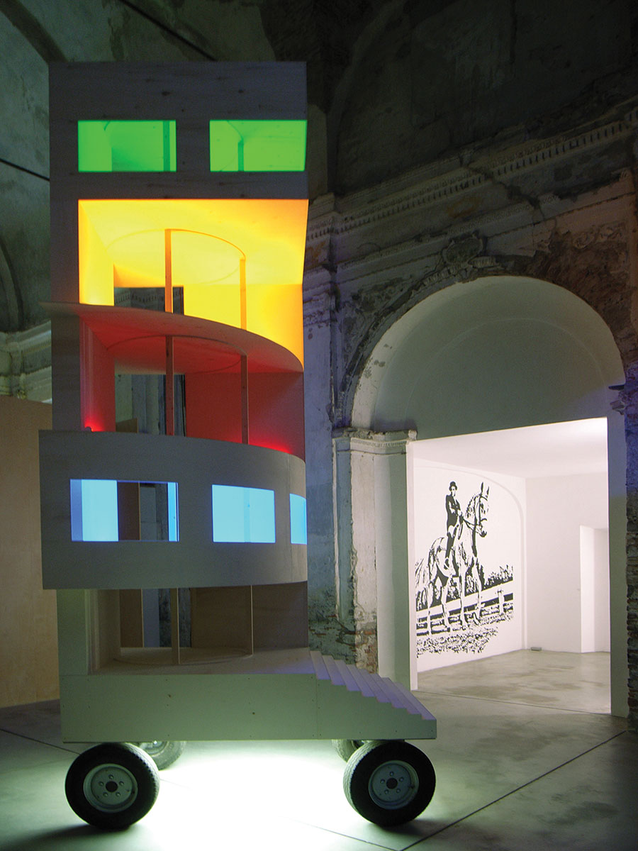 The Novocomum on Wheels reads like a political manifesto. The rolling tower breaks free of its foundation moorings, rupturing in a single gesture the connection to the city’s historical destiny. Floating, so to speak, above the political noise of the previous century, the liberated. Novocomum assumes an entirely new transgressive identity. Papadimitriou’s fragmented object can be fused to a multiplicity of alternative contexts, an abandoned church, a contemporary streetscape, a digital network, a conceptual 3 dimensional forum. The hybrid product reasserts its independence precisely by spectacularizing its mundane content, setting forth new dialectic possibilities both in relation to itself and in relation to the city of Como.