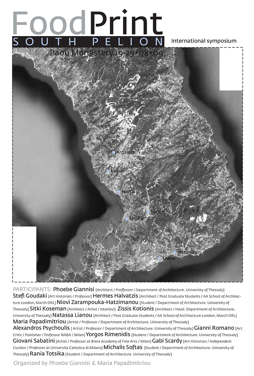 The international symposium FoodPrint was organized by Maria Papadimitriou and Phoebe Giannisi over a ten-day period in the Monastery of St. Nicholas in the region of Pau, South Pelion. It resulted in a multicultural gathering where residents stayed together with artists, art theorists, architects, and teachers and students from the Department of Architecture at the University of Thessaly.