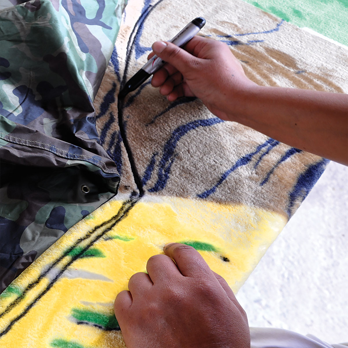 These blankets are the first object they take with them when they leave. Whether rich or poor they insist on sleeping on them. This precious unit, when transformed into a coat, becomes the dwelling of the body. It changes identity from ‘extremely private’ to ‘overtly public.’”